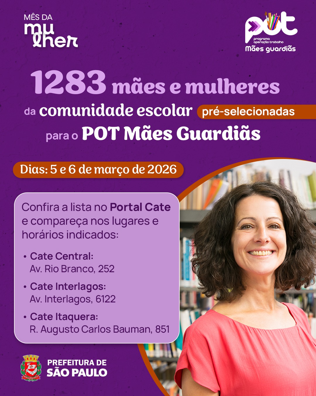 Em celebração ao Mês da Mulher, a Prefeitura de São Paulo convoca nesta segunda-feira, 2 de março, 1.283 novas beneficiárias para o Programa Operação Trabalho – POT Mães Guardiãs. As mães e mulheres da comunidade escolar se inscreveram no início deste ano e estão sendo chamadas gradualmente para serem inseridas na rede municipal de ensino. Entre as atividades estão a busca ativa escolar, a fim de evitar a evasão escolar, e apoio em hortas pedagógicas das escolas.