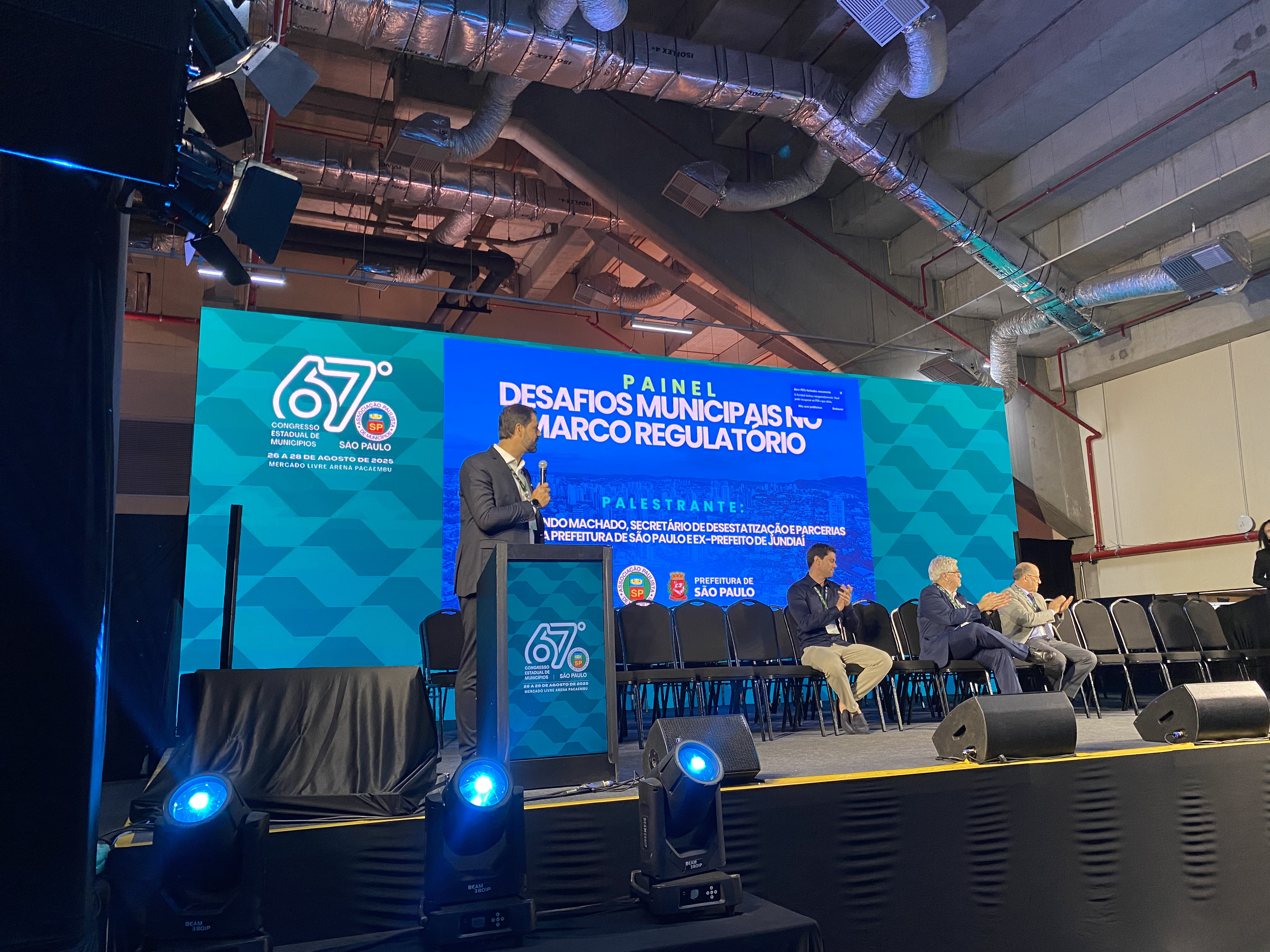 A Secretaria Executiva de Desestatização e Parcerias (SEDP) esteve na programação do primeiro dia de atividades 67º Congresso Estadual de Municípios, nesta terça-feira (26), realizado na Mercado Livre Arena Pacaembu. O painel “Saneamento e Universalização: Desafios Municipais no Marco Regulatório” contou com a participação do secretário da pasta, Luiz Fernando Machado, entre os palestrantes.